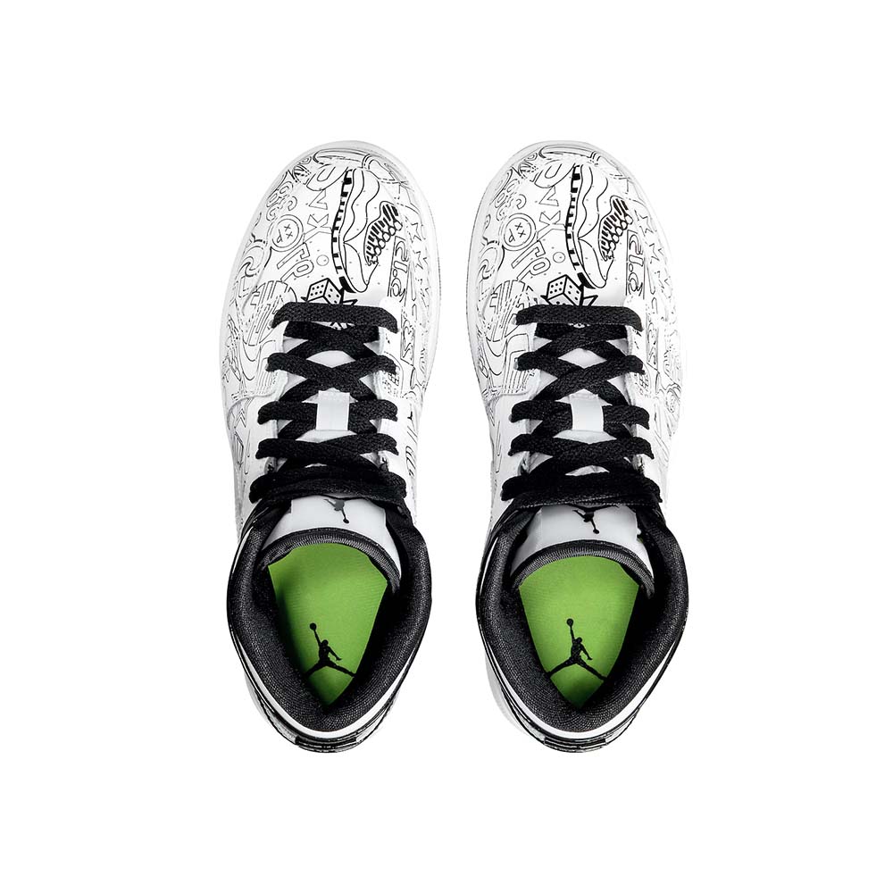 Jordan Brand will be releasing a new Air Jordan 1 Mid “DIY” colorway that will be available exclusively in kids sizing.Dressed in a White, Black, and Volt color scheme. This Air Jordan 1 Mid encourages kids to create their own colorful design. The shoe features blank outlines of memorable logos, silhouettes and more with clear Swooshes on the sides, Volt Wings logo and insoles along with Black patent leather overlays in the rear. Jet Black laces, Jumpman logos, lining, and rubber outsole completes the design.